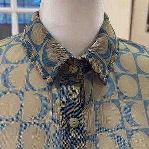 Pull & Bear Geometric Patterned Sheer Button-Up Top. Green & blue. Size M