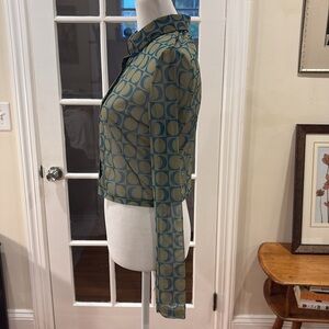 Pull & Bear green and blue geometric design sheet button down cropped shirt. Size M. Measurements are 18” from armpit to armpit and 17” long.