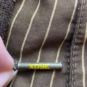 Pull & Bear XDYE Brown Striped Board Shorts Size Large . Gently used condition. Front Velcro and tie. Yellow Heavy Machinery graphics left leg. Brown mesh liner. One back pocket. Measures waist 35”, inseam 9.5”, rise 12.5”.
