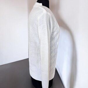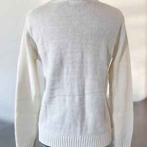 Cold winter weather doesn’t have to mean bundling up in loads of boring, bulky clothing to stave off the cold. It can be a great chance to show off your sense of timeless style. Our symmetrical knit sweater is a perfect example of how fashionable you can be while staying toasty. A straight fit and long straight sleeves reaching the bottom of the wrist are trimmed with ribbed knit stitches. Hand wash. Dry flat. It is available in ivory.
