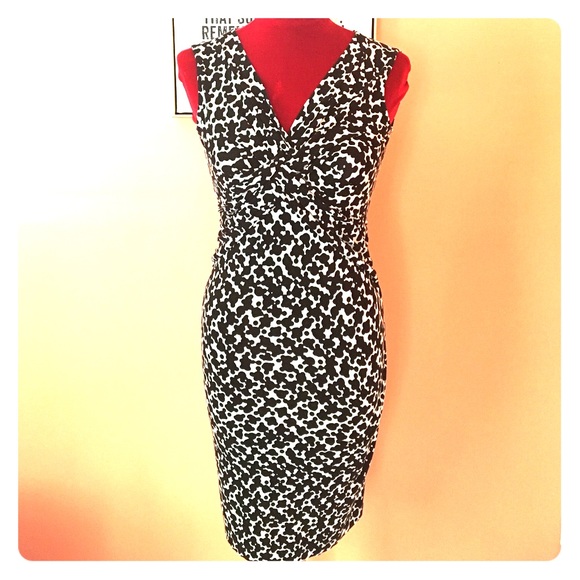 Beautiful black and white dress. Form fitting, below knee. Pretty cross fabric design at the bust. Great to dress up or down and good in all seasons!