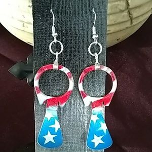 Pull ring tabs are from 1975 soda cans. Handmade and hand spray painted with spacescape designs and embellished in mini rhinestones. The second set is a patriotic design. Designer and artist is my brother Eric. He has many more pull tab jewelry and can be made to order. Each set is $25 or can bundle for more savings.