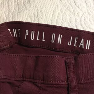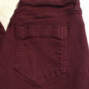 Pre-owned. See pictures for details and measurements. Color deep red. Two functioning pockets on back. Very stretchy.