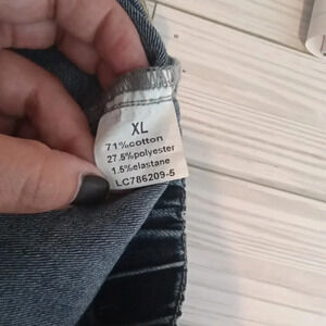 no brand name pull on denium pants ..they have elastic waistband n drawstrings...they are distressed..very comfortable they have stretch..there in good condition straight leg. approx measurements Rise:13" length:28" measurements are taken flat lay. 71%cotton 21% polyester 1.5% elastane...