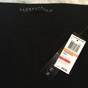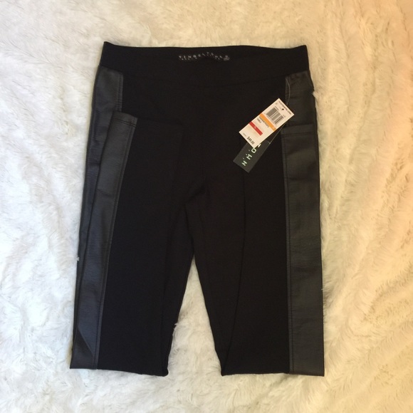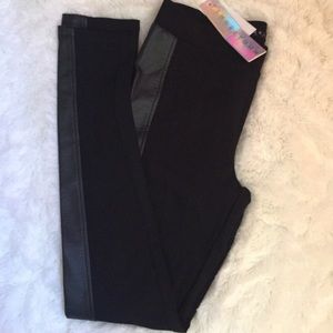 Pants features no lining, no pockets, skinny legs, ponte knit fabric, faux leather side trim, and pull-on style.