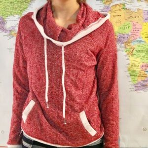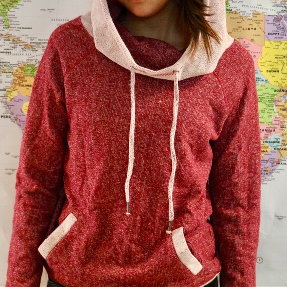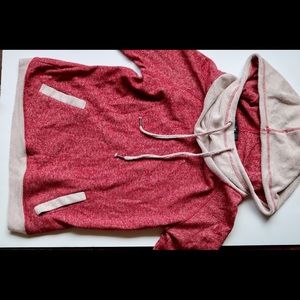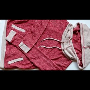 It has a soft, faded maroon fabric. On the other side of the fabric it has a creamish color with the maroon underneath that shows on the outside at the end of the sleeves, the top of the pockets, the hood, pull strings and the bottom of the shirt. It has a hood but can also just lay on your shoulders if you readjust it (like I show in one of the pictures) The fabric is thinner than a regular hoodie but It still keeps you warm. ⭐️Great condition, only worn once. 🚫no trades