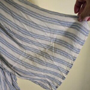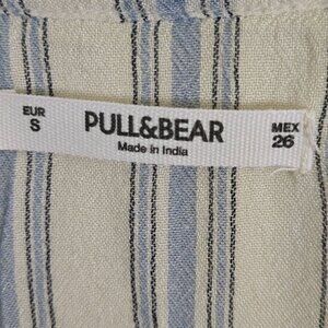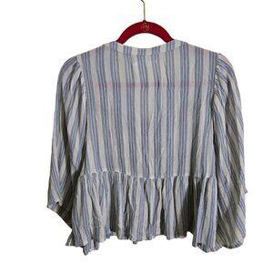 Bohemian-inspired Pull&Bear peasant top, embellished with embroidery and beads. Features flowy half sleeves. Handcrafted in India. Size M. Cropped, Tie V Neck Closure, Blue white Striped Gauze