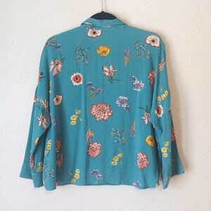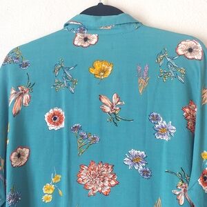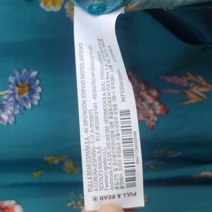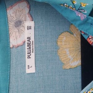 Pull&Bear blue crop length boxy button down with one large breast pocket and 3/4 length sleeves. Floral print, collar, oversized look.