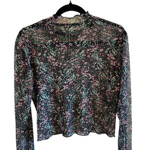 Pull&Bear Floral Mesh Long Sleeve Top. Features a lightweight mesh material with dainty flowers throughout, frill hem, collar and sleeves. The color is black with pink flowers and green leaves. Care tag was taken out, material is soft and lightweight, perfect addition to your summer wardrobe. Great preowned condition, no flaws, rips or stains.