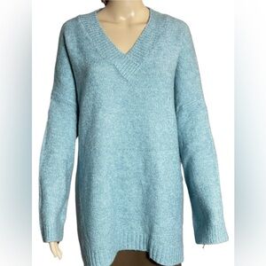 Pull&Bear, blue sweater, pullover, V-neck, soft knit, casual, fall fashion, relaxed fit, drop shoulder, women's sweater, long sleeve, solid color, machine washable, new condition.