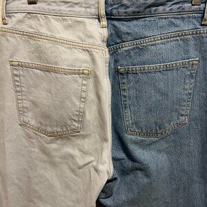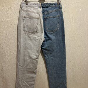High Rise Straight in half light / half mid blue with super high rise. Size: US 8 / EU 40 | Rise: 12" | Inseam: 33" | Leg opening: — Fabric: Unknown (likely cotton) Condition: Very good; light wear Details: Zip fly; Made in Turkey; split color design Measurements are approximate where noted. Smoke-free. Open to offers—bundle to save!