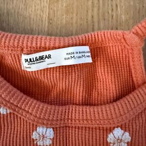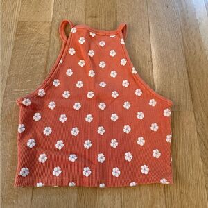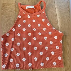 Elevate your wardrobe with this Pull&Bear tank top, featuring a vibrant orange hue and a chic ribbed texture. The crop style and high neckline offer a modern twist, while the delicate white floral pattern adds a touch of elegance. Perfect for sunny days, this top combines comfort and style effortlessly. Size medium, only worn once.
