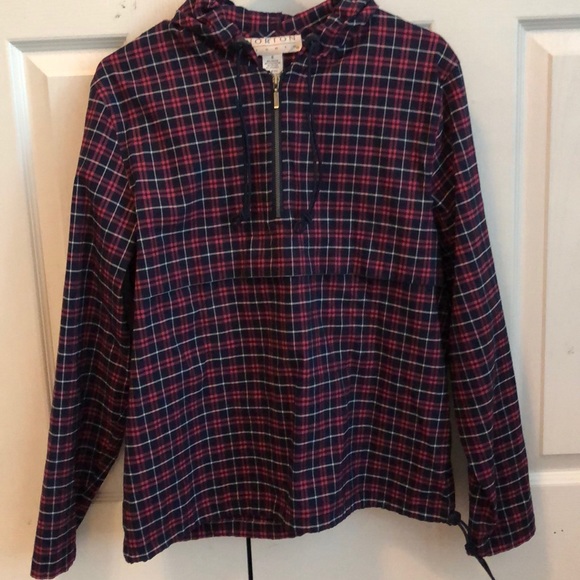 Pink and navy blue plaid, with hood and adjustable cord for hood and bottom. Mid-way zip up and a hidden zipper in front