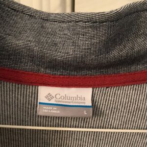 Men’s Columbia half zip pullover. 60% cotton, 40% polyester. The color is blue with a hint of gray. Very good condition.