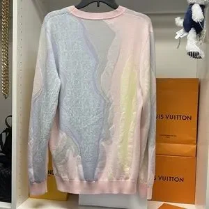 Regular crew-neck pullover. Ribbed collar, cuffs and edges. Made of wool knit with all-over abstract Fendi Earth inlay pattern in pink, light blue and lilac. Embellished with Fendi Karligraphy motif.