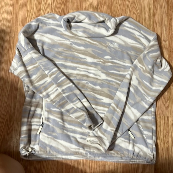 has a zip up pocket on the front and drawstrings on the bottom and the sleeves are cuffed