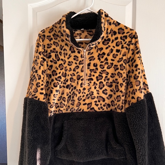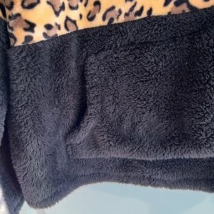 Fluffy puller over with zipper front and front pockets. Runs a little short on length but still comfy. Runs small for size stated. Hardly worn. No tears for snags.
