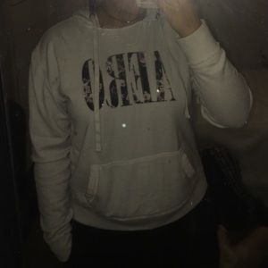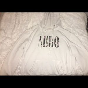It is a white hoodie with the word AERO on the front written in floral lettering