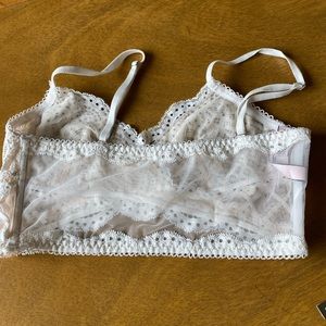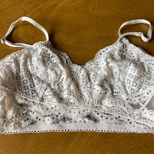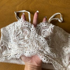 Like brand new pullover lace bra. It looks like a cross over front bra and does not have removable straps. Straps are adjustable. Not underwire but there is wire on either side on the ribs. No padding. Super comfortable!! Off white.