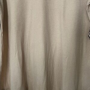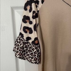 Cute light tan pullover top with animal print sleeves with ruffle detail. Sleeve length is half sleeve. Fabric is a waffle type knit. No size tag but guessing a large. Pit to pit measures around 21 1/2”. Good used condition.