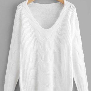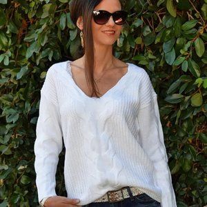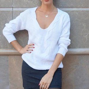 This pullover sweater features a cable knit fabric on the front, sleeves with v-collar line in a fitting silhouette.