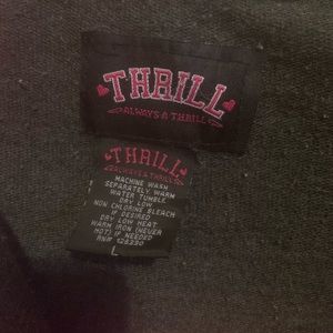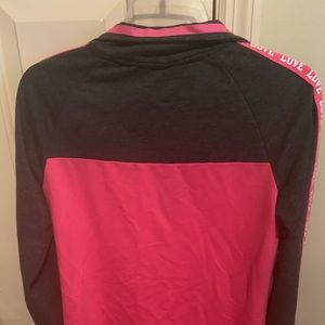This graphic half zip pullover jacket is pink and gray with white letters of the word love written on it. It it’s a snug fit but in good condition.
