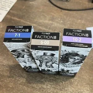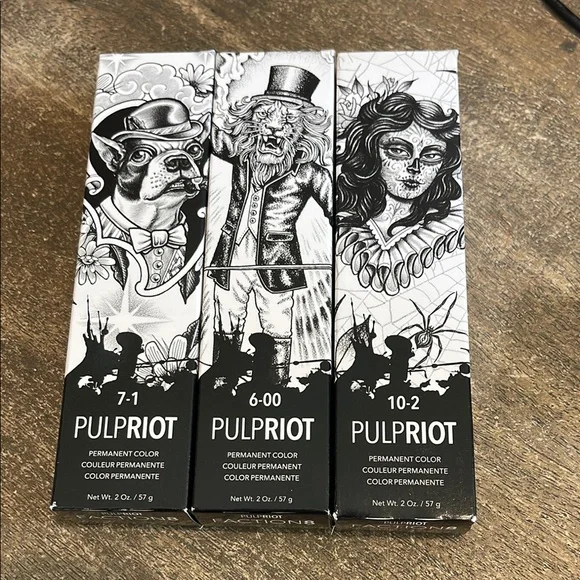 Set of Pulp Riot permanent hair colors. Includes shades 7-1, 6-00, and 10-2. Unique artistic packaging. New