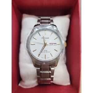 The Pulsar PXN203X Men's White Dial Silver-Tone Stainless Steel Dress Watch is a stylish and sophisticated timepiece perfect for formal occasions or everyday wear. Featuring a white dial with silver indices, this quartz movement watch includes a date indicator and multiple hands for added functionality. The stainless steel bracelet/link band offers a comfortable and durable option for the wrist, while the fixed bezel adds a touch of elegance to the classic round watch shape. With a timeless design and quality craftsmanship, this Pulsar watch is a must-have accessory for any man's collection.