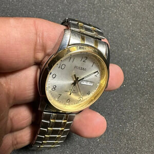 Pulsar Watch Men Silver Gold 2 Tone Round Dial Stretch Band Working New Battery watch shows significant signs of wear such as scratches on case band and crystal as well as discoloration and tarnishing see pictures for reference