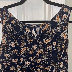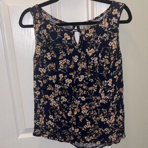 Elevate your wardrobe with this elegant floral sleeveless top. Featuring a navy base with delicate floral patterns, it's perfect for any occasion. Great fall piece!