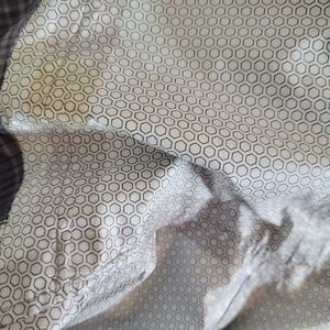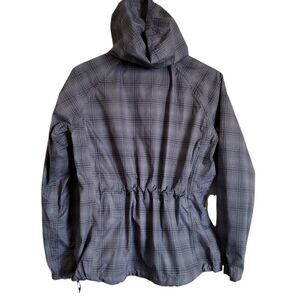 lightweight gray windbreaker. Different pattern on inside of windbreaker. Zip-up pockets. Synch up Cords on the bottom and in the back of jacket. There is a spot on the end side. size small.