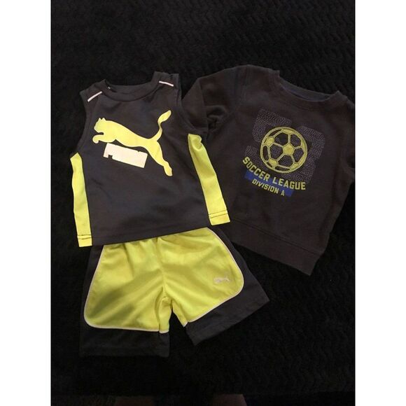 12m 2 pc puma tank top and short set and a jumping beans soccer sweatshirt lot. Great used condition. I usually ship within 2 days. Thank you so much for buying from me!