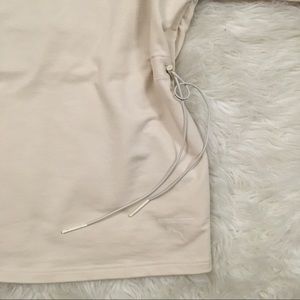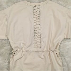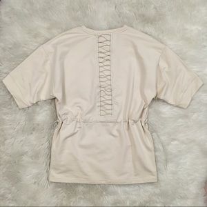 Athletic top with lacing up the back. Cording at waist allowing for adjustable fit. Dry-cell fabric is good for wicking the moisture away from the body. Fabric thickness is similar to a heavier weight t-shirt material.