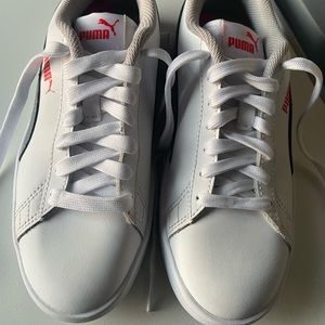 Spanking Clean White ⚪️|Gray🔘|Red 🔴 Big Kids Puma sneakers Size 4 . The inside sole of the shoe is a light gray. These shoes are truly in great if not perfect condition they look Brand New!!