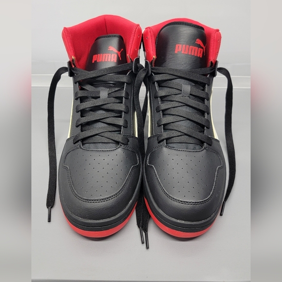 Puma Rebound LayUP Mid Top Sneakers. Men's Size 14. Black, White and Red. No box or tags, but they're in excellent condition. Never been worn, and they've always been stored in the plastic drawers you see in the last 2 pics. I have 2 or 3 pairs of the same sneakers, so I'm parting with some of my collection.