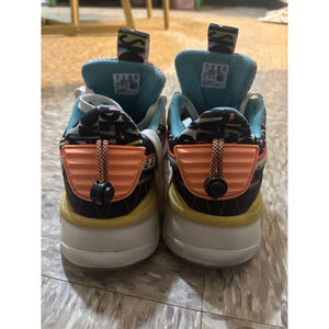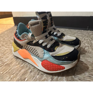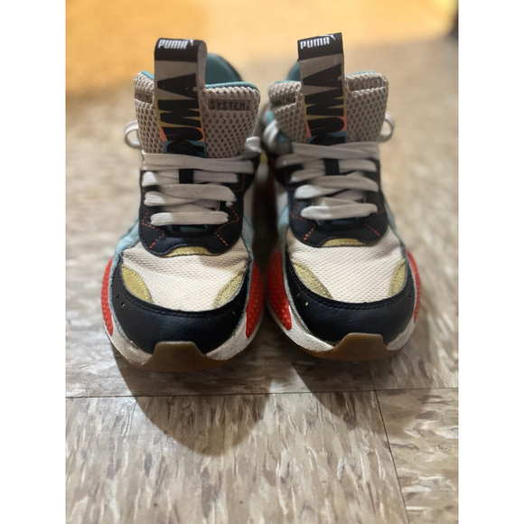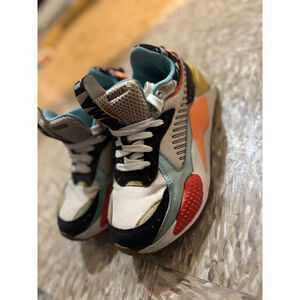 These are the PUMA RS-X HC sneakers, featuring a vibrant, color-blocked panel design based on the brand's 1980s Running System technology
