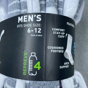 Moisture-wicking crew socks with cushioned footbeds, arch support, and stay-up cuffs. Made of polyester, cotton, and spandex for comfort and durability. Fits men's shoe sizes 6-12.