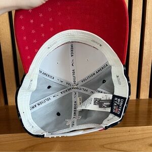 cap with bold red brim. White interior with 'America' text. Blue exterior with star pattern. One size