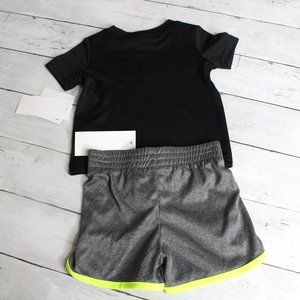 This two-piece short set includes a black short sleeve athletic tee shirt top with lime green and gray logo and a pair of coordinating gray and lime green shorts. The set brand new with tags. If you have twins or need more than one, let me know. I have two available.