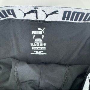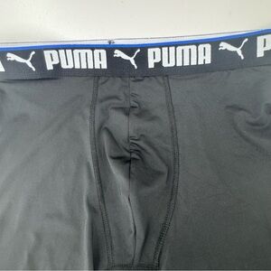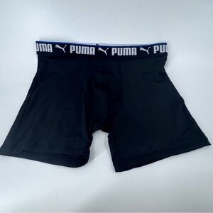 These Puma boxer briefs feature a sleek black design with a comfortable elastic waistband adorned with the iconic Puma logo. Made from a stretchy fabric, they offer a snug fit and athletic cut that provides ample leg coverage for everyday comfort.