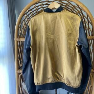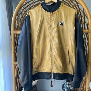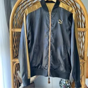 •Puma• Black & Gold Satinester Fabric gives it a luxurious look that is perfect for nights out or game night. The jacket features a collarless ribbed design, waist length, ribbed cuffs a regular fit that is comfortable and versatile.