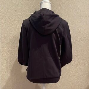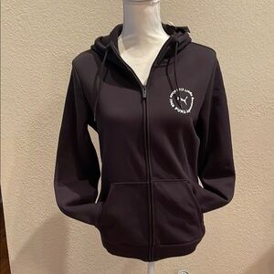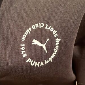 This Puma hoodie features a sleek black design with a full-length zipper and a fitted silhouette. Made from soft material, it includes a hood for added comfort and style. The small white logo on the chest adds a touch of branding to this versatile top.