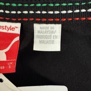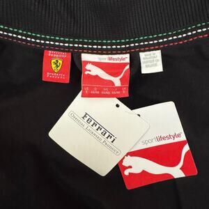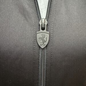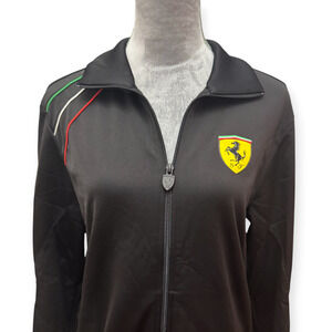 Sleek black jacket. Features red, green, and white accents on the shoulder and Scuderia Ferrari on the back. Puma logo on chest. Full zip front with Ferrari logo zipper pull.