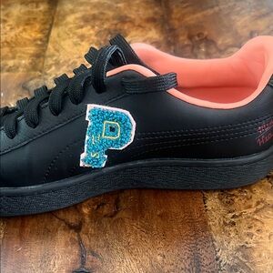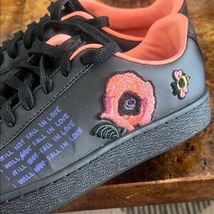 Stylish black sneakers featuring pink floral embroidery and unique text detail. Perfect for casual wear.