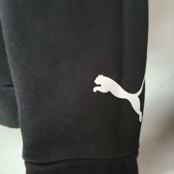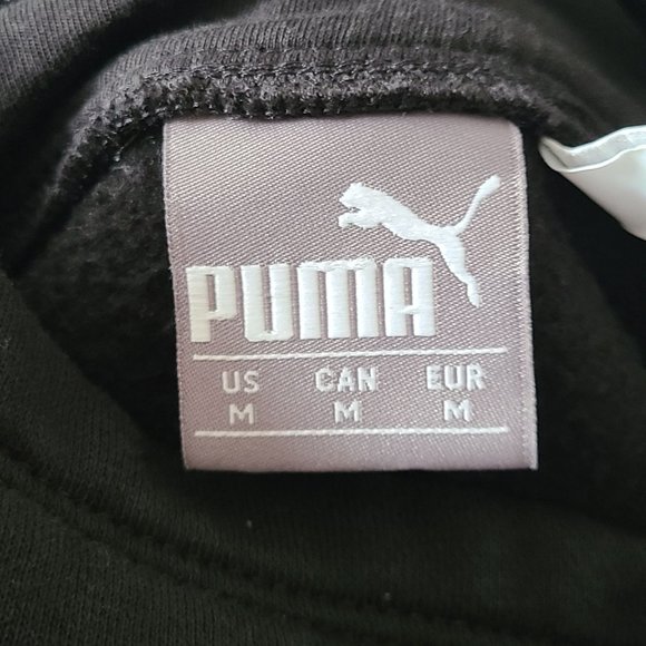 Good used condition Puma black pullover sweatshirt with asymmetric cowl neck. Black with white outline logo on front and on left cuff. Some regular wash wear to fabric otherwise no stains/tears visible. See photos for approximate measurements.