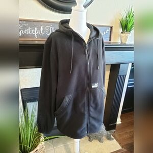 Stylish black fleece zip-up hoodie with front pockets and a hood. Features a small logo on the pocket. Front pockets have a zipper.