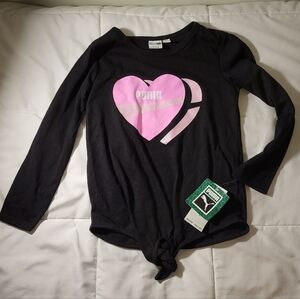 Long sleeve black shirt with pink heart design and matching pink leggings