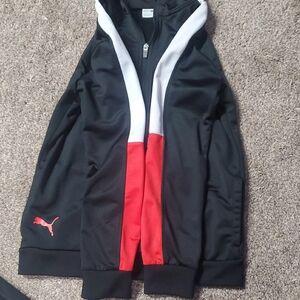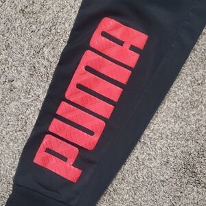 Puma hoodie set in black with red accents. Bold logo design. Comfortable and stylish. Barely worn. Size 14/16 no marks, holes or stains that I see.