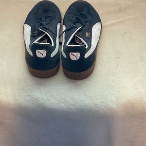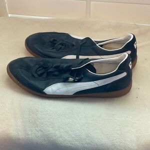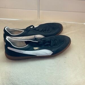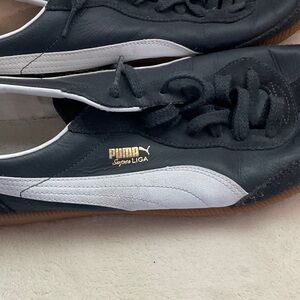 Sleek Puma sneakers featuring a black upper with white accents and a brown sole.