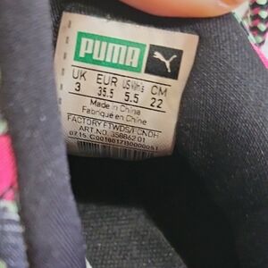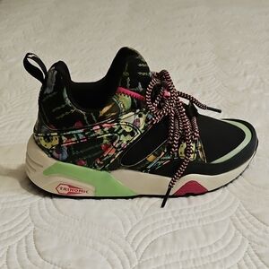 Stylish Puma sneakers with a black and green design. Features colorful laces and a unique pattern.